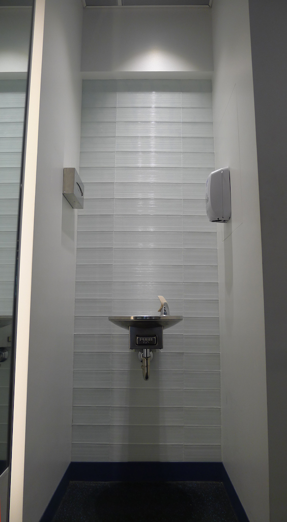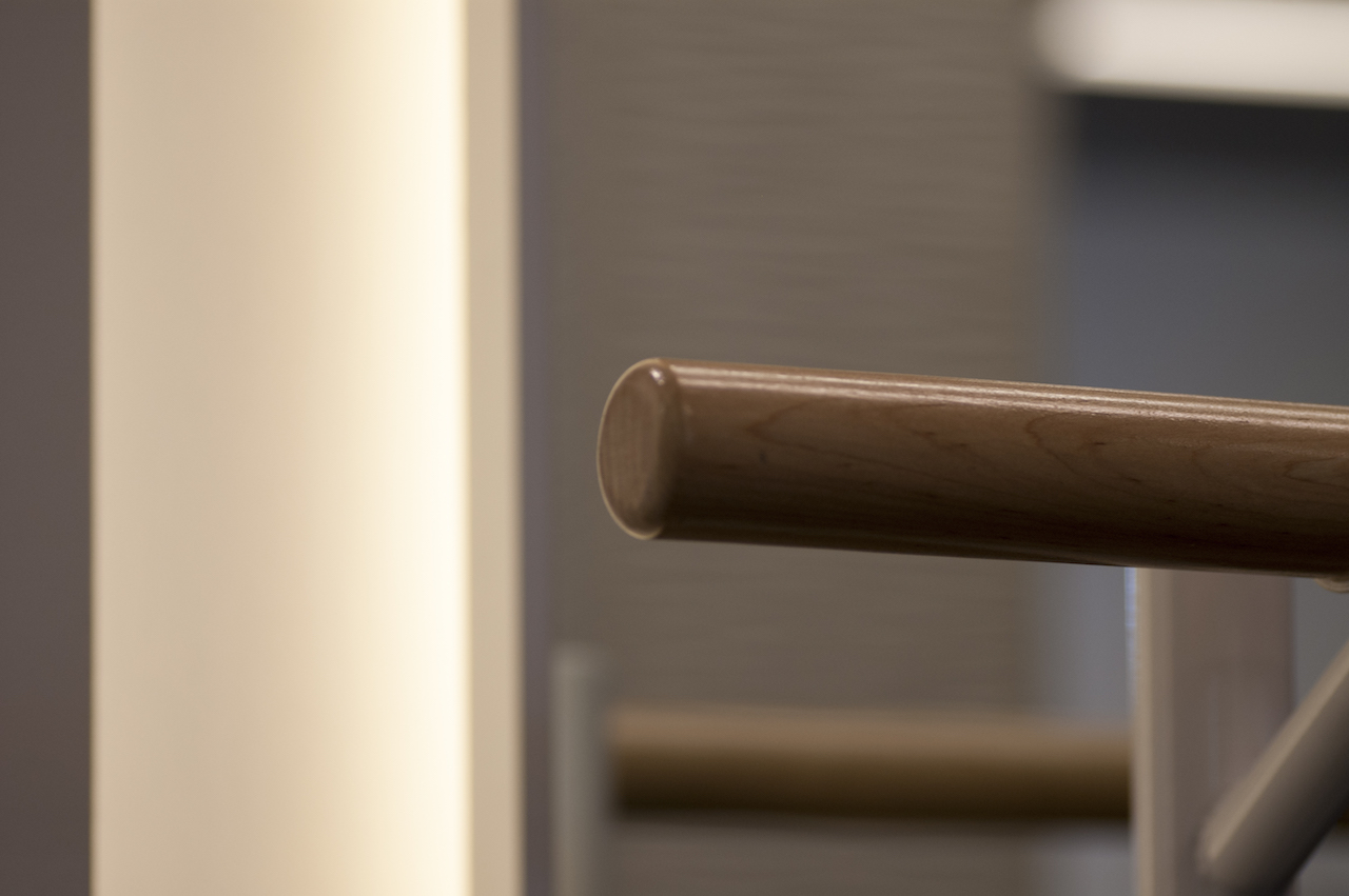 This look was accomplished with the use of linear striated Wolf Gordon wallpapers, waved ASI millwork panels, and grooved glass tiles. By emphasizing the contrast between low ceilings (hiding the HVAC system) and the exposed waffle slab above, the project is able to make the most of the existing conditions of the space