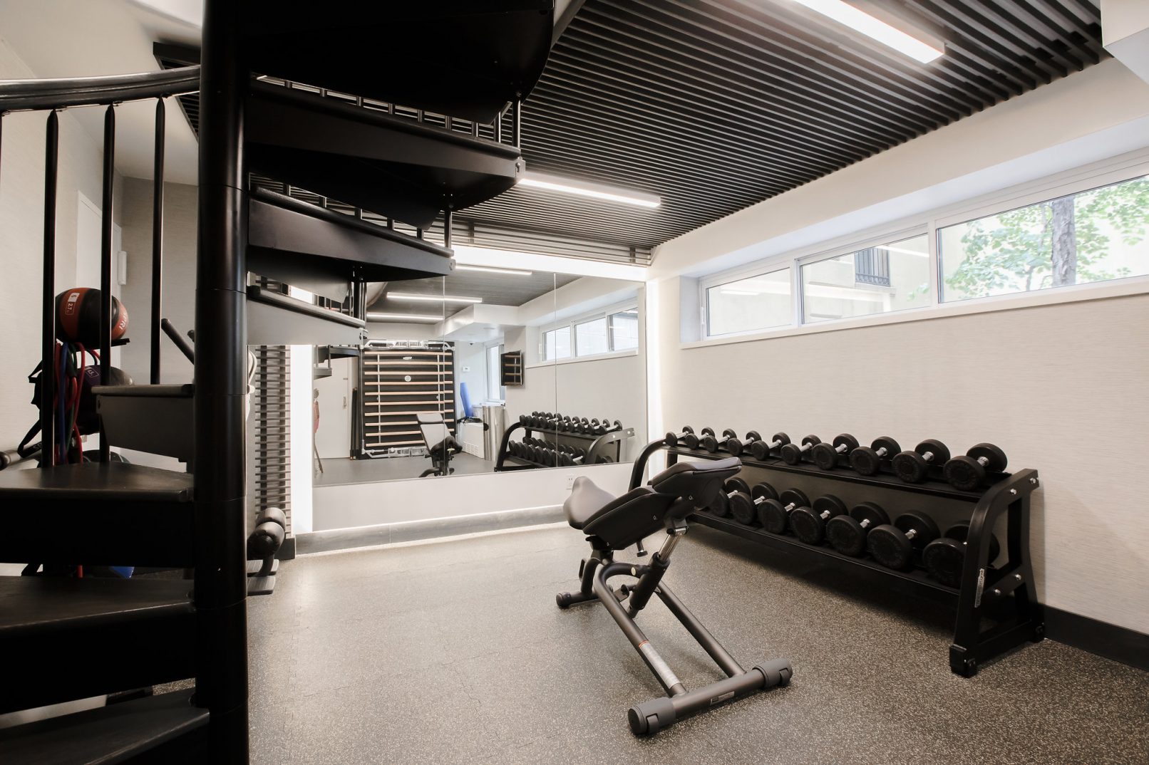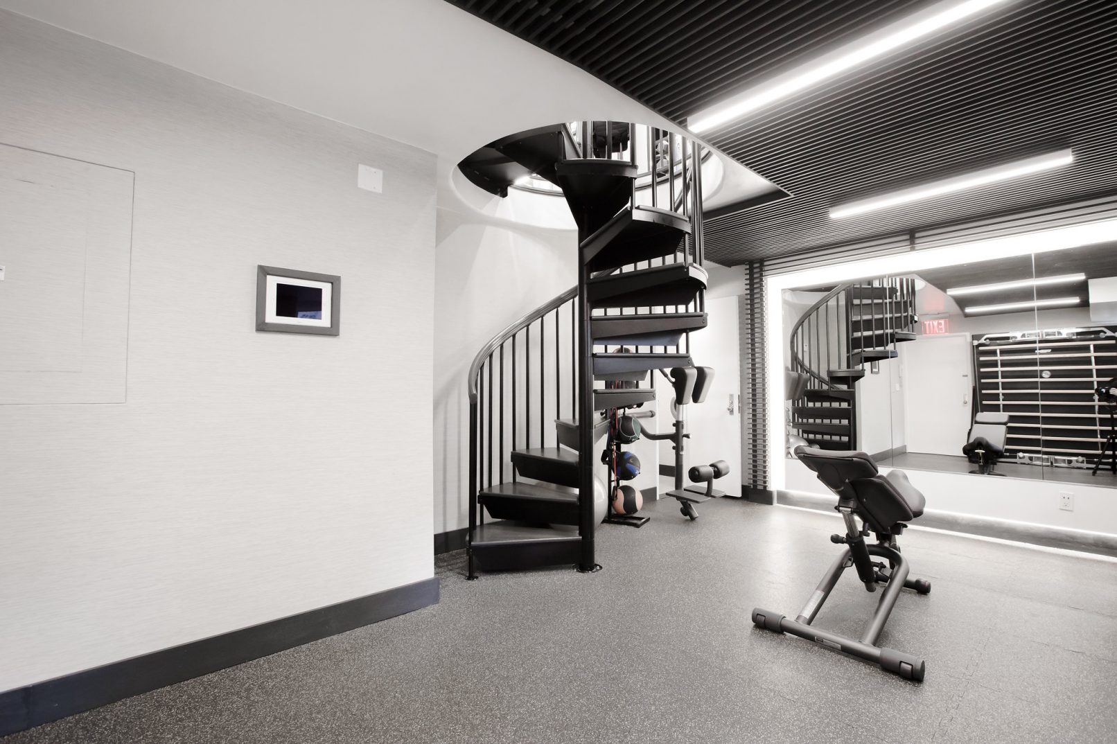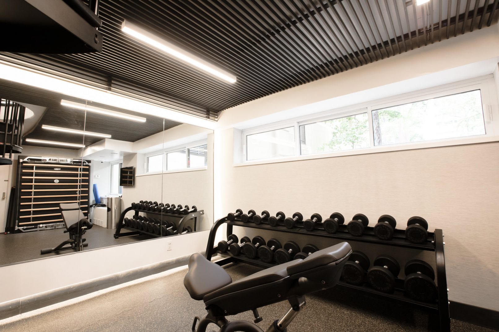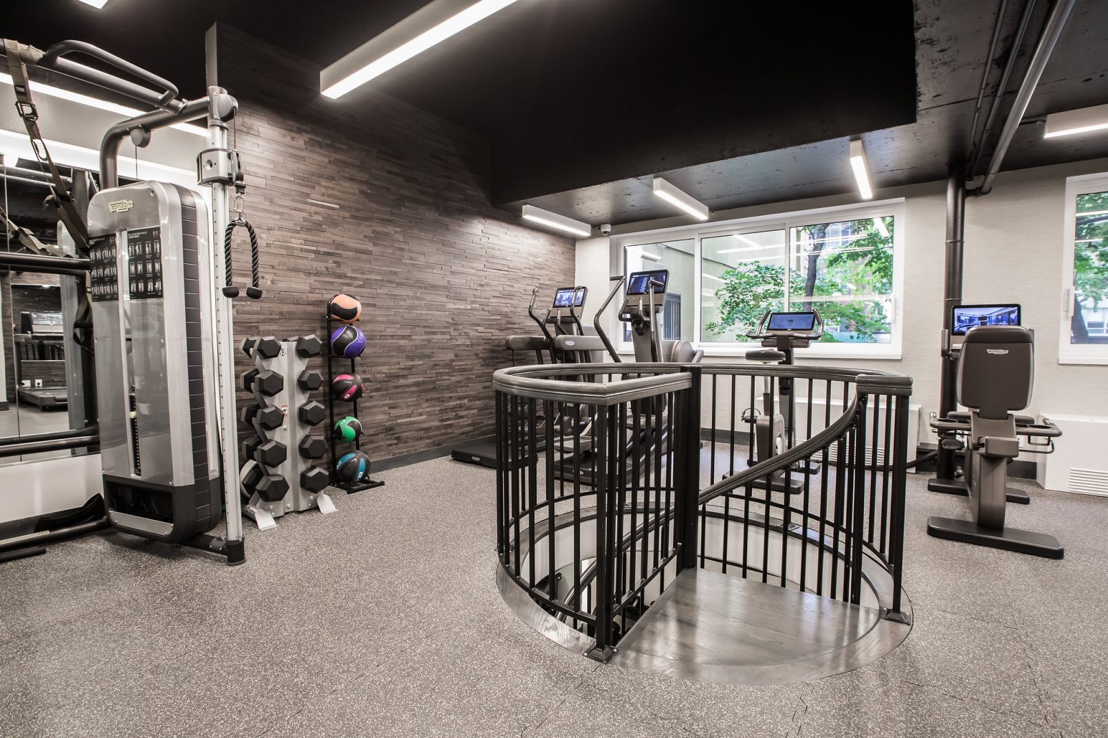 This project involved the conversion of an unused mezzanine space into a new exercise room. As a luxury building, the co-op wanted the space to show a certain level of refinement while still being durable enough to last under daily use by a large co-op community. This look was accomplished by contrasting high finish wood millwork panels with exposing the concrete slabs and conduits above.