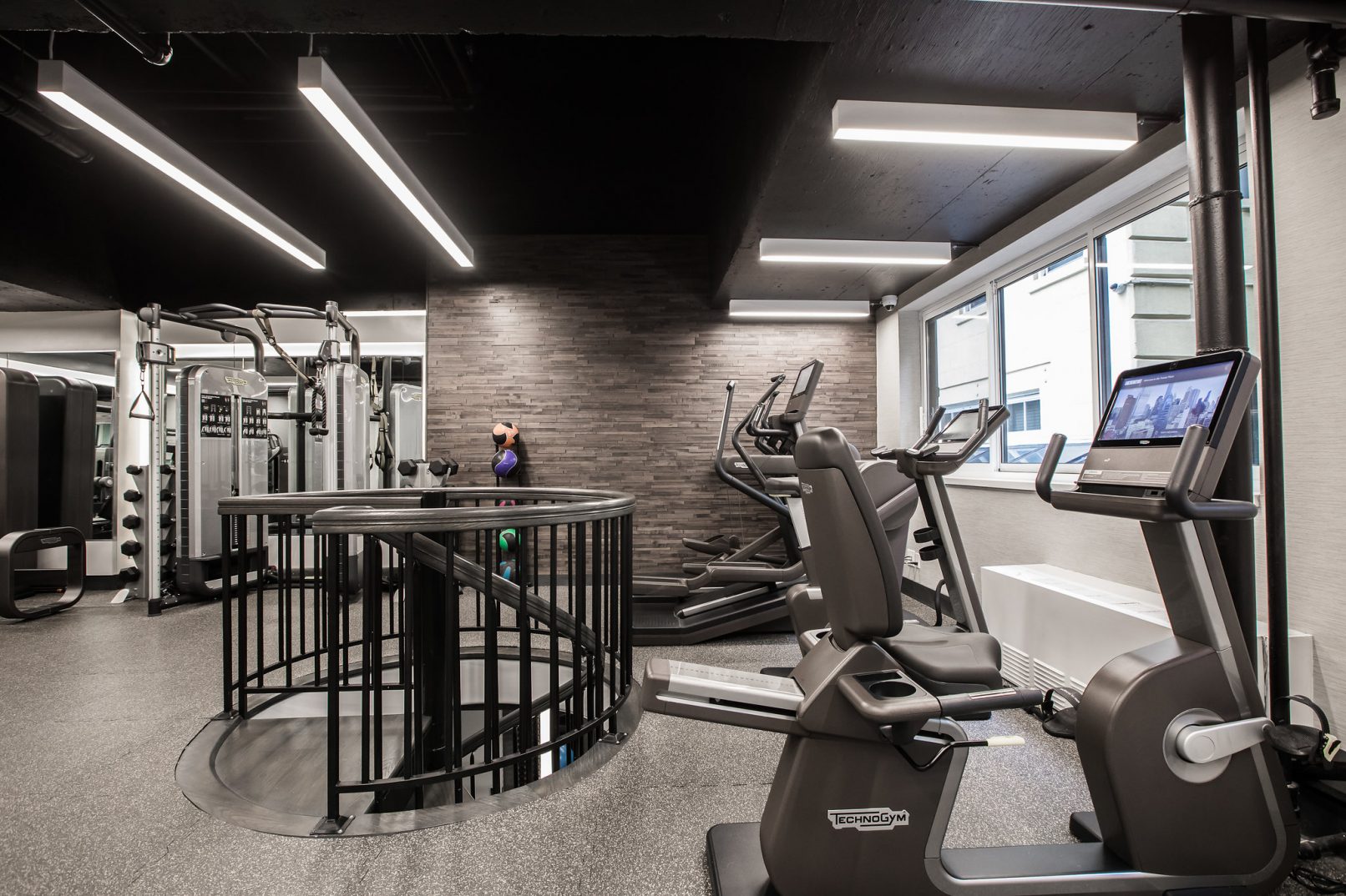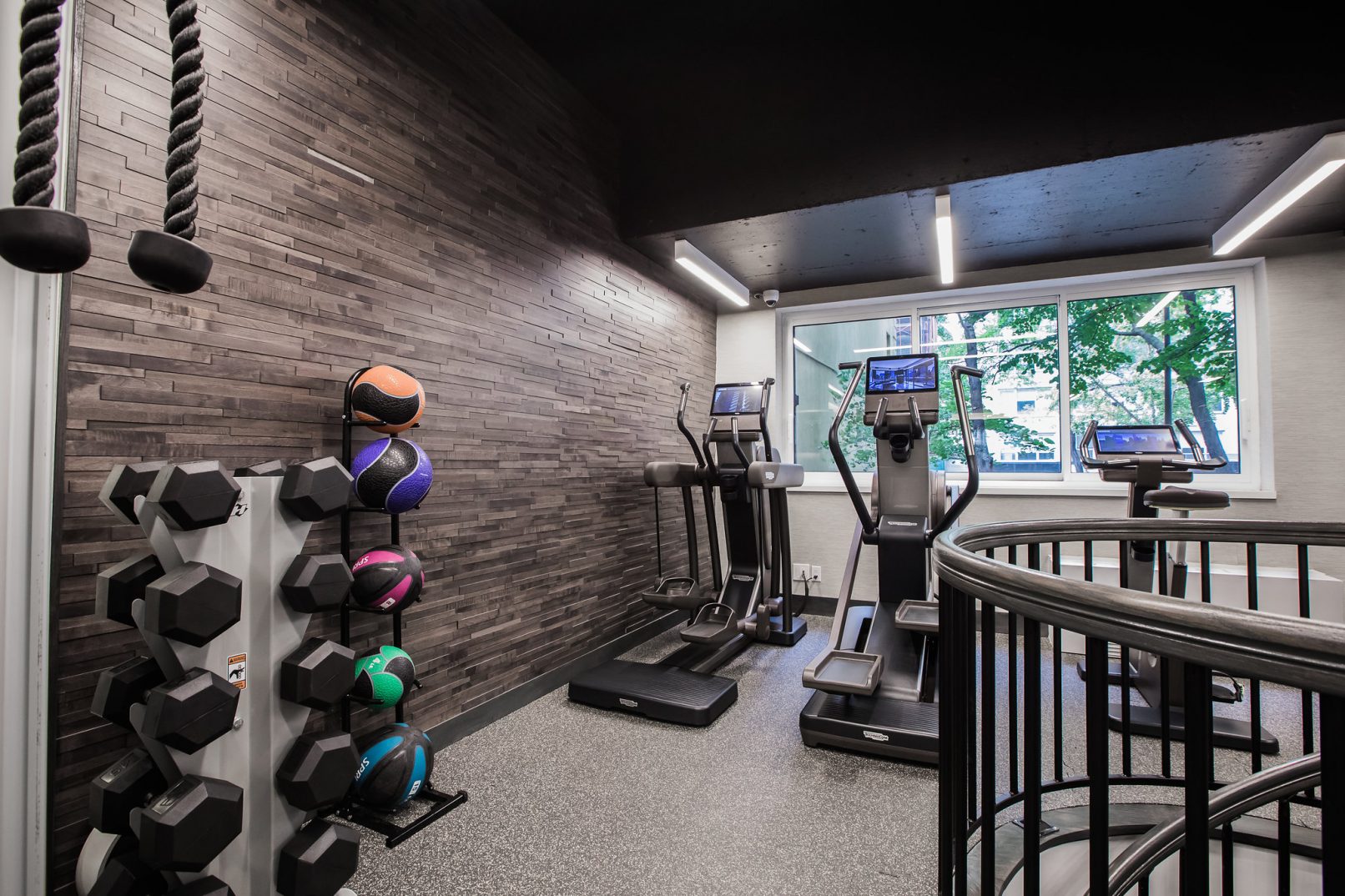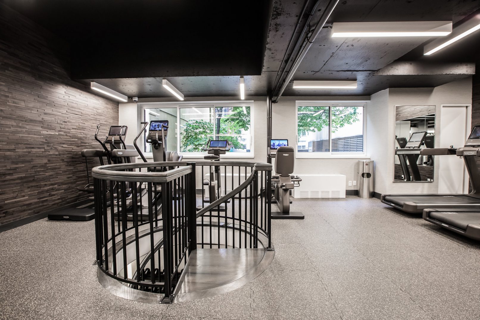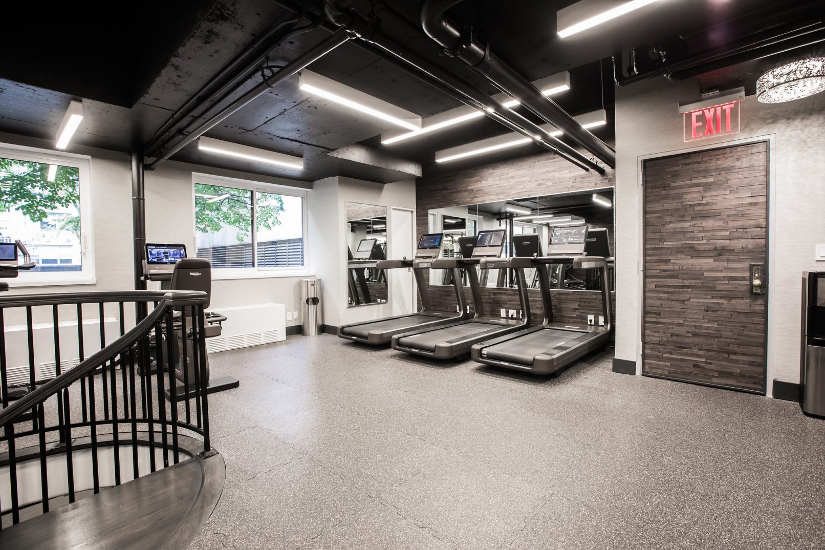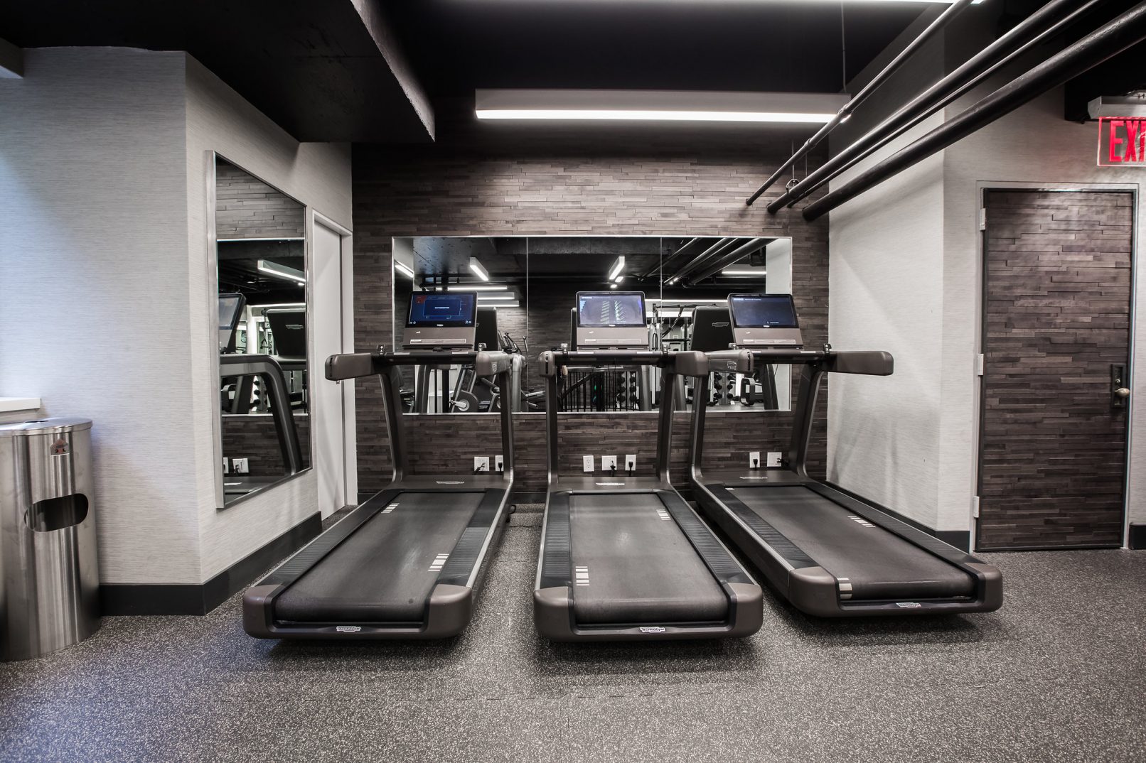 This project involved the conversion of an unused mezzanine space into a new exercise room. As a luxury building, the co-op wanted the space to show a certain level of refinement while still being durable enough to last under daily use by a large co-op community. This look was accomplished by contrasting high finish wood millwork panels with exposing the concrete slabs and conduits above.