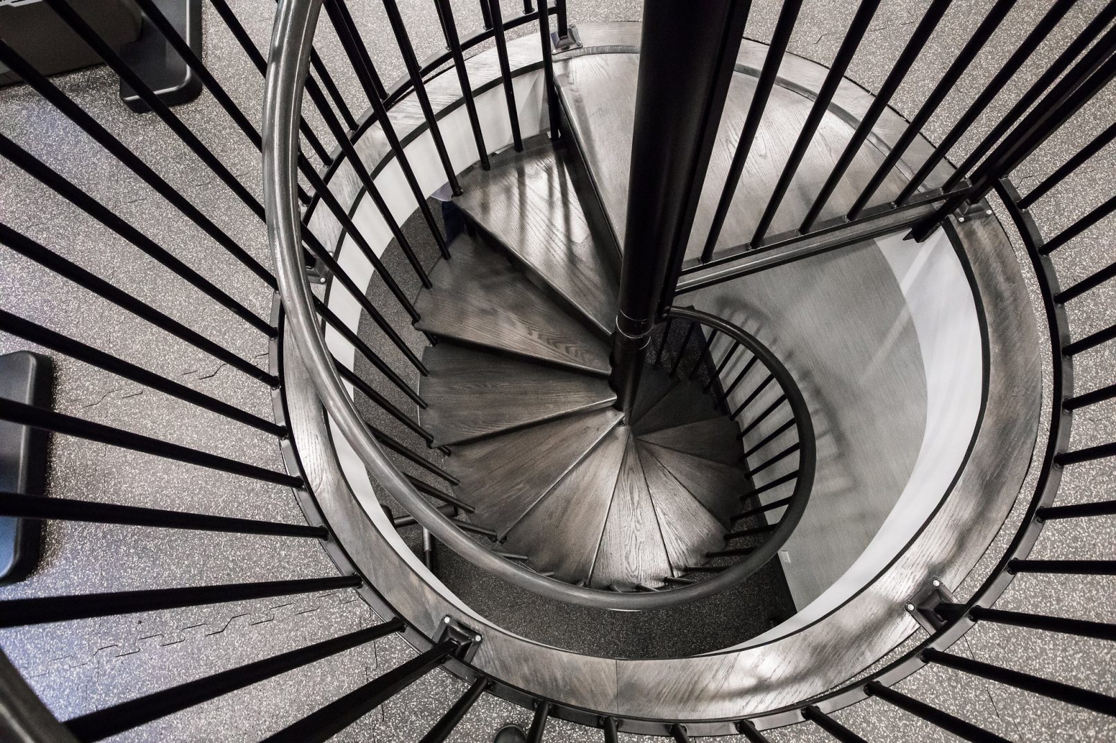 One major opportunity with this project was the addition of a spiral stair, unifying two unused areas to combine into an upper exercise room with a lower yoga and meditative space (marked with a Armstrong wood slat ceiling).